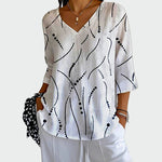Balta blusa su juodomis linijomis ir taškeliais yra tobula paprastumo ir elegancijos kombinacija. V formos iškirptė prideda moteriškumo, o patogus audinys ją daro idealiai tinkančią tiek kasdieniam dėvėjimui, tiek iškilmingesnėms progoms.