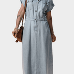 Džinsinė Maxi suknelė – patogi ir elegantiška, ideali vasaros stiliui ir rafinuotumui.