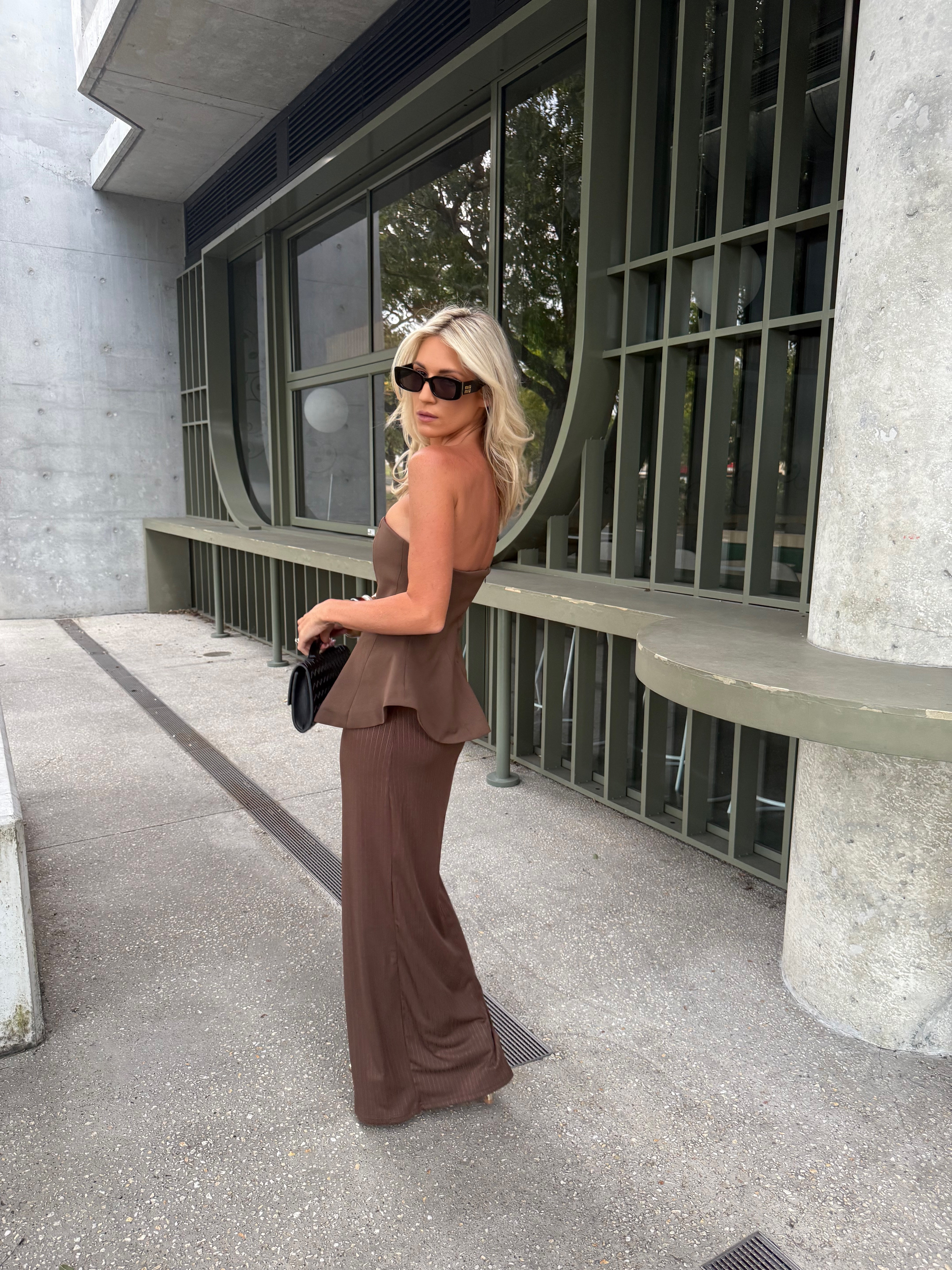 Maxi Suknelė Elliana yra tobula šiuolaikinio rafinuotumo išraiška. Su savo peplum stiliaus viršumi ir tiesia ilga sijonu, ji formuoja siluetą su žavesiu ir sklandumu. Dvigubas pamušalas užtikrina komfortą ir struktūrą, o sijono grioveliai prideda gylio ir rafinuotumo minimalistiniam dizainui.