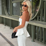Peplum stiliaus viršus akcentuoja liemenį, o tiesus sijonas ilgina figūrą su rafinuotumu.