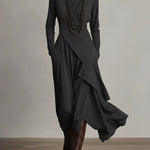 Gražiai plazdanti, ilgomis rankovėmis siluetas elegantiškai seka kūno linijas net judant. Neringa Maxi Suknelė sujungia komfortą, rafinuotumą ir nesenstančią eleganciją. Minkštas, aukštas kaklo dizainas ir asimetrinės, krentančios detalės sukurtos taip, kad suteiktų liekninantį, ilginantį efektą, tuo pačiu užtikrinant natūralų elegantišką ir lengvą nešiojimą. Puikus pasirinkimas elegantiškoms vakarienėms, ypatingoms progoms ar rafinuotam kasdieniam įvaizdžiui – suknelė, kuri įkūnija santūrią pasitikėjimą ir moterišką gracingumą.