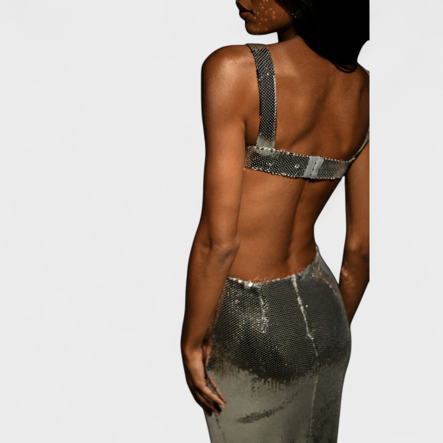 Suknelė „Gala Silver“ prikausto dėmesį nuo pirmo momento. Jos blizgių blizgučių audinys elegantiškai atspindi šviesą, o šoninės išpjovos seksualiai apibrėžia siluetą. Sukurta moterims, kurios drįsta spindėti kiekviename žingsnyje.