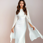 Ši ilga suknelė sujungia satino švelnumą su subtiliu šifono blizgesiu, sukurdama drabužį, kuris švelniai apglėbia siluetą ir plazda kiekvieno judesio metu. Atviros šifono rankovės ir reguliuojama nėrinių juosmens dalis suteikia pusiausvyrą tarp struktūros ir sklandumo, puikiai tinka ypatingoms progoms, kur stilius ir komfortas žengia kartu.