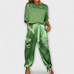 Šis dviejų dalių komplektas, pagamintas iš kvėpuojančios ir minkštos medžiagos, suteikia elegantišką ir universalią išvaizdą, tinkamą tiek dienai, tiek vakarui. Trumpa rankovė priduria rafinuotos elegancijos, o plačios kelnės užtikrina maksimalų komfortą ir judėjimo laisvę.