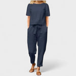 Su apvalia iškirpte, trumpomis rankovėmis ir plačiomis kelnėmis, komplektas suteikia elegantišką išvaizdą su visiška judėjimo laisve.