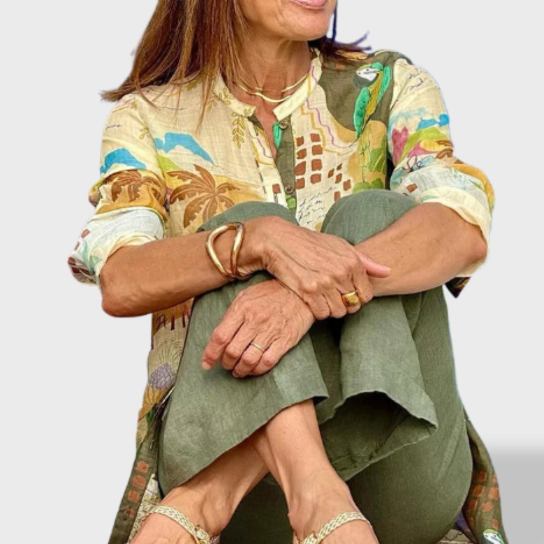 Sklandumas, lengvumas ir atsipalaidavusi rafinuotumas apibūdina Inês™ komplektą. Pagamintas iš natūralios lininės medžiagos ir su dizainu, įkvėptu tropinio dvasios, šis įvaizdis yra puikus pasirinkimas saulėtoms dienoms, lauko susitikimams ar stilingoms kelionėms. Spausdinta viršutinė palaidinė ir plačios kelnės sukuria pusiausvyrą tarp komforto ir žavesio, kuris nepastebėtas nelieka.