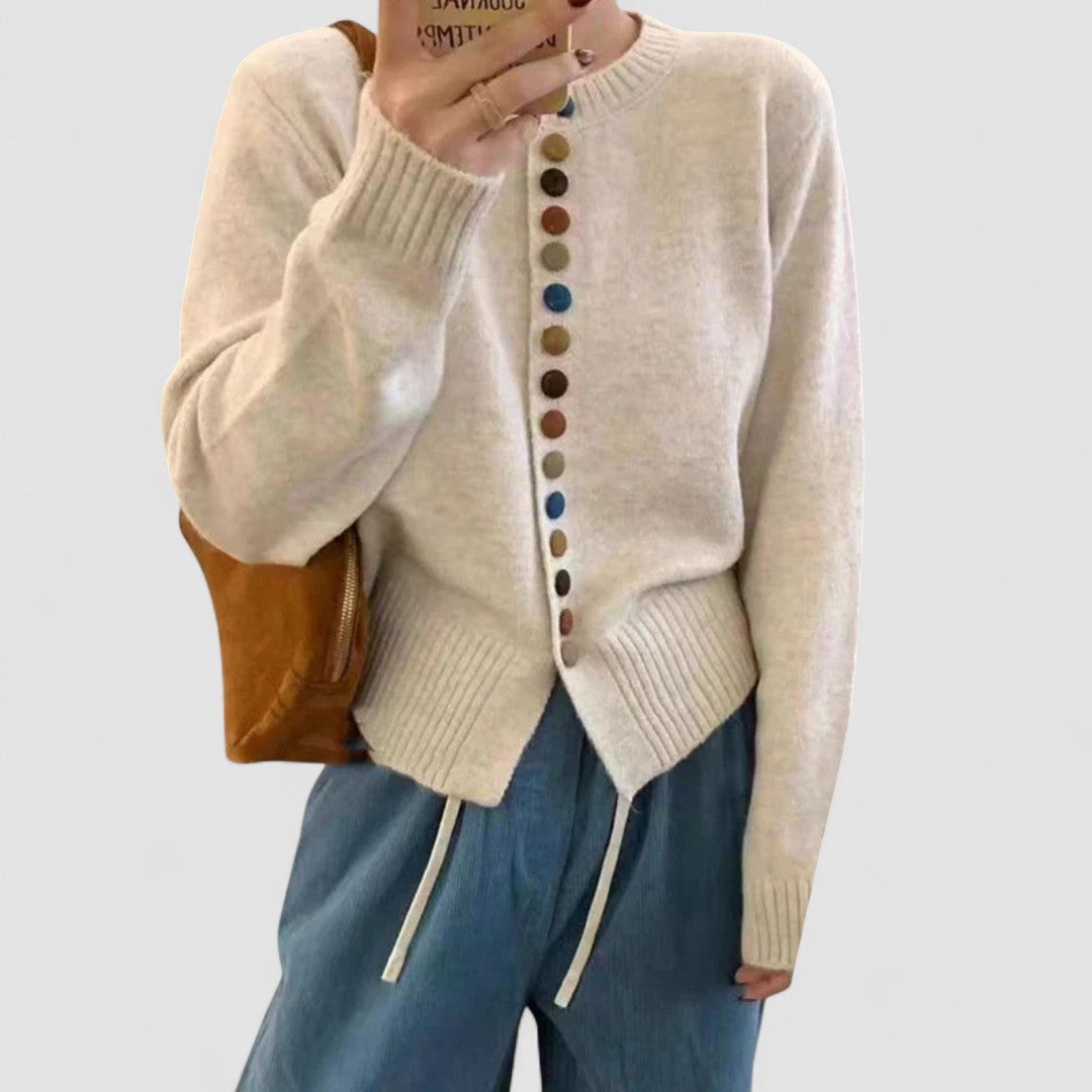 • Žavūs mygtukų detalės – Spalvingų mygtukų eilutė, suteikianti asmenybę klasikinei megztai medžiagai