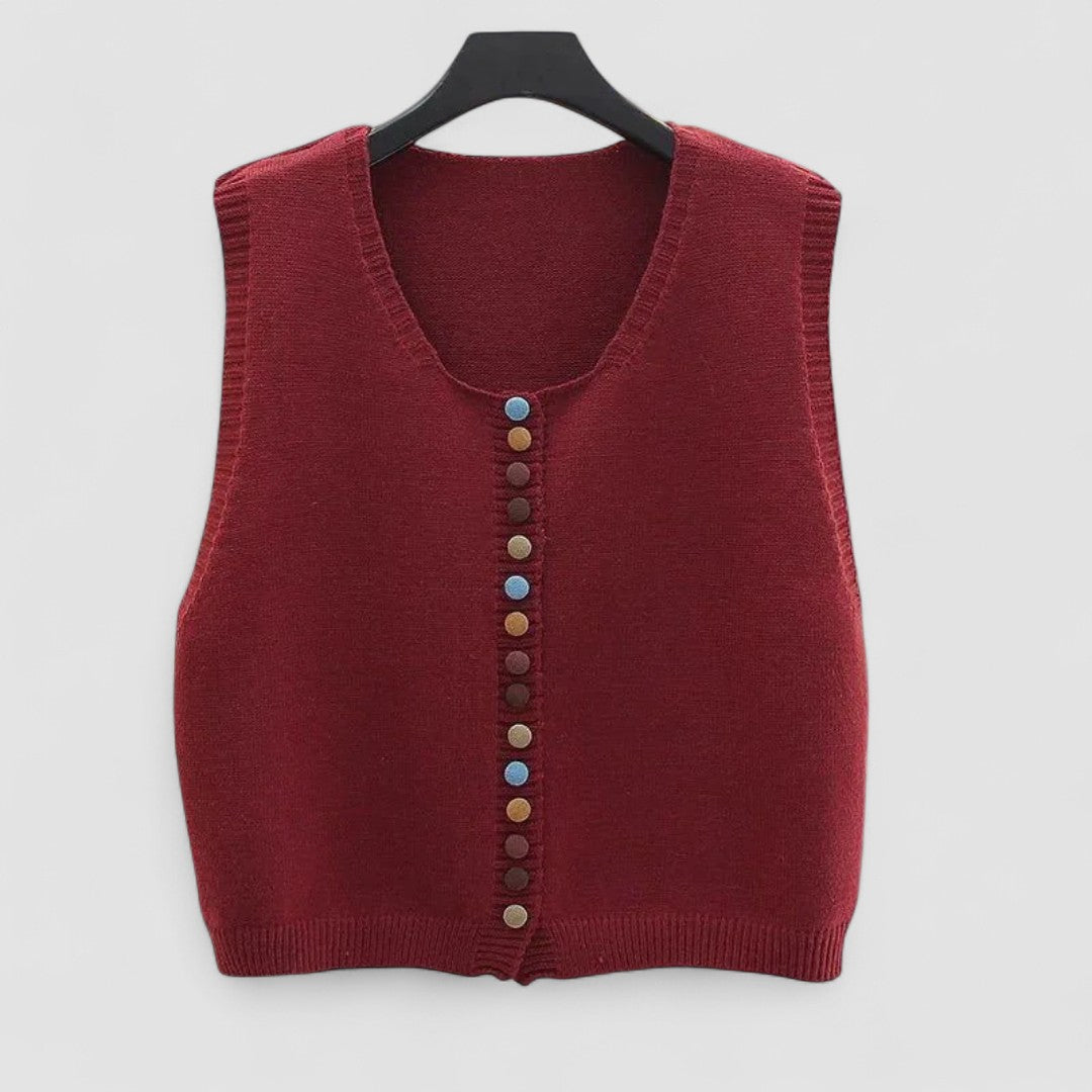 Pristatome Maribele megztinį su spalvotais mygtukais — elegantiškas sluoksniavimo drabužis, sukurtas tam, kad suteiktų šilumos ir asmenybės jūsų kasdieniams įvaizdžiams. Su savo minkštu mezgimu ir linksmais spalvotais mygtukais, šis megztinis sujungia linksmus akcentus su klasikinio stiliaus elementais.