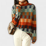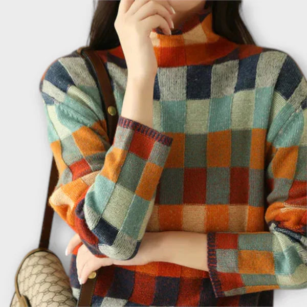 Šis patogus ir elegantiškas megztinis išsiskiria savo ryškiu languotu raštu. Su aukštu apykakle ir figūrą pabrėžiančiu kirpimu, tai yra išskirtinė detalė, kuri lengvai pagyvina bet kokį derinį.
