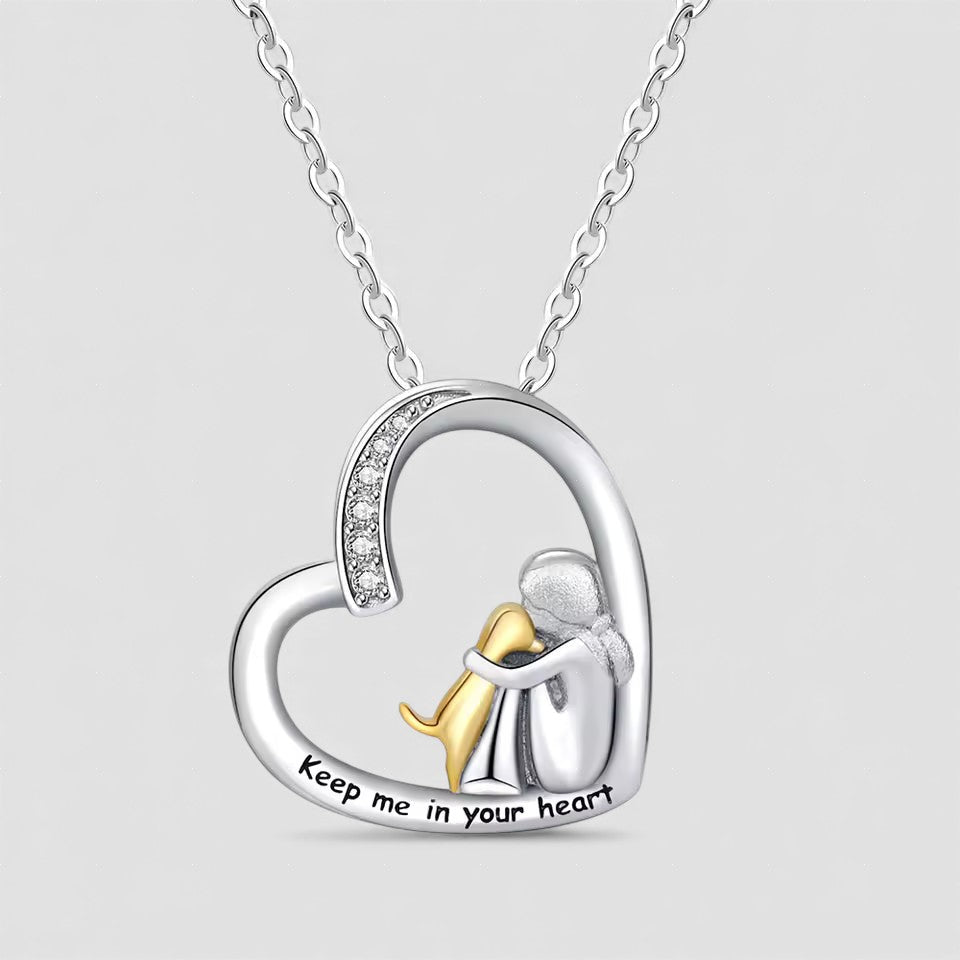 Šis kaklo papuošalas yra subtilus būdas išlaikyti meilę visada šalia. Dizainas vaizduoja moterį ir jos šunį švelnioje ir mylinčioje apkaboje — paprastas, švelnus ir pilnas prasmės. Jis lengvas, lengvai derinamas su bet kokiu drabužiu ir yra graži priminimas apie amžiną ryšį.