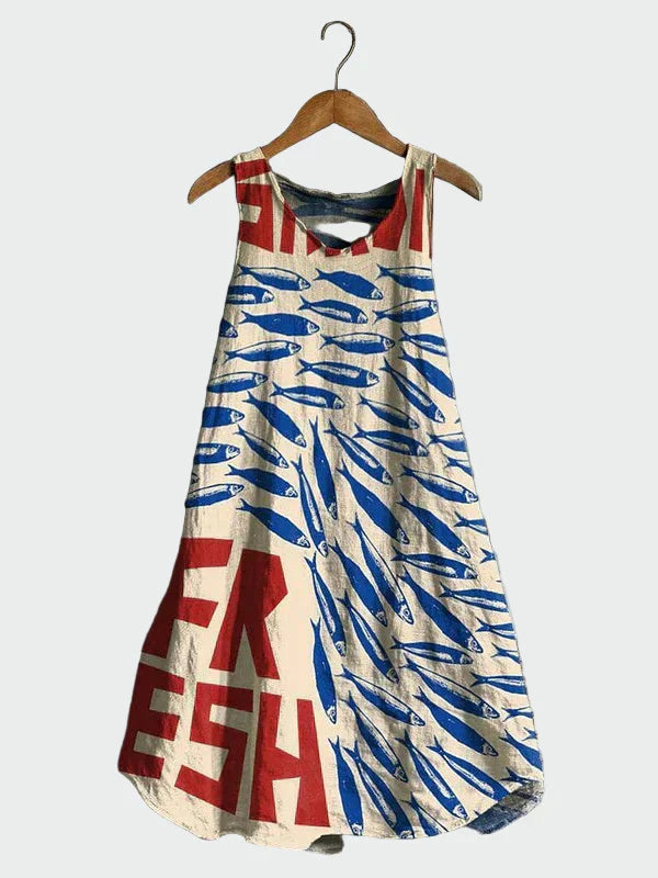 Pridėkite linksmą ir vasarišką akcentą savo stiliui su šia suknele, dekoruota sardinių raštu. Išskirtinis raštas suteikia lengvumo ir džiaugsmo jausmą, o patogus kirpimas daro ją idealia kasdieniams įvaizdžiams tiek pajūrio, tiek miesto vietose.