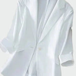 Elegantiškas švarkas su nesenstančiu kirpimu ir moderniu dizainu. Jis turi apykaklę su atlapais, priekinį užsegimą su mygtuku ir ilgomis rankovėmis su dekoratyviniais mygtukais ant galo. Jo tiesi linija daro jį idealiu tiek profesionalioms prezentacijoms, tiek atsipalaidavusiems momentams. Drabužis, suteikiantis stiliaus ir rafinuotumo bet kokiam įvaizdžiui.