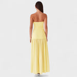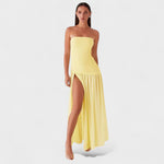 Ši ilga suknelė be petnešų yra elegancijos simbolis be pastangų. Su savo be petnešų iškirpte ir sklandžia sijono forma su šonine skeltuke, ji švelniai pabrėžia figūrą, tuo pačiu leidžiant laisvę judesiams. Išvaizda, kuri kalba pati už save, puikiai tinka ypatingai naktiai.