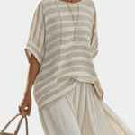 Atpalaiduotas ir natūraliai žavus, Daisy komplektas sujungia švelnaus kirpimo dryžuotą bluzoną su laisvomis kelnėmis ir plačiu prijuostu. Bambuko lino audinys suteikia gaivumo, švelnumo ir judėjimo, idealiai tinka saulėtoms dienoms paplūdimyje arba ramiems pasivaikščiojimams mieste.
